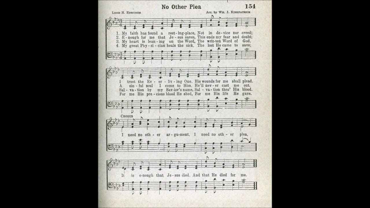 I need no other argument I need no other plea. I trust the ever living One That He for me will plead. I trust the ever-living One His wounds for me shall plead.